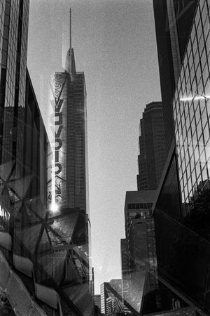 Double exposure of various downtown Los Angeles buildings on Kodak Professional T-Max P3200 35mm film.