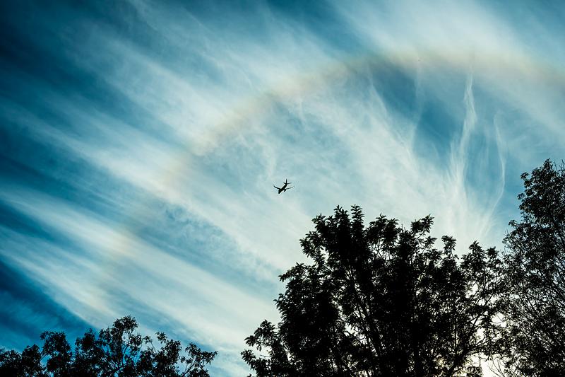 Airplane flying over a park with cirrus clouds and a sun halo.