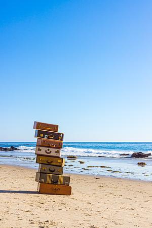 Vintage luggage stacked on the sand at a beach. Vertical aspect ratio.